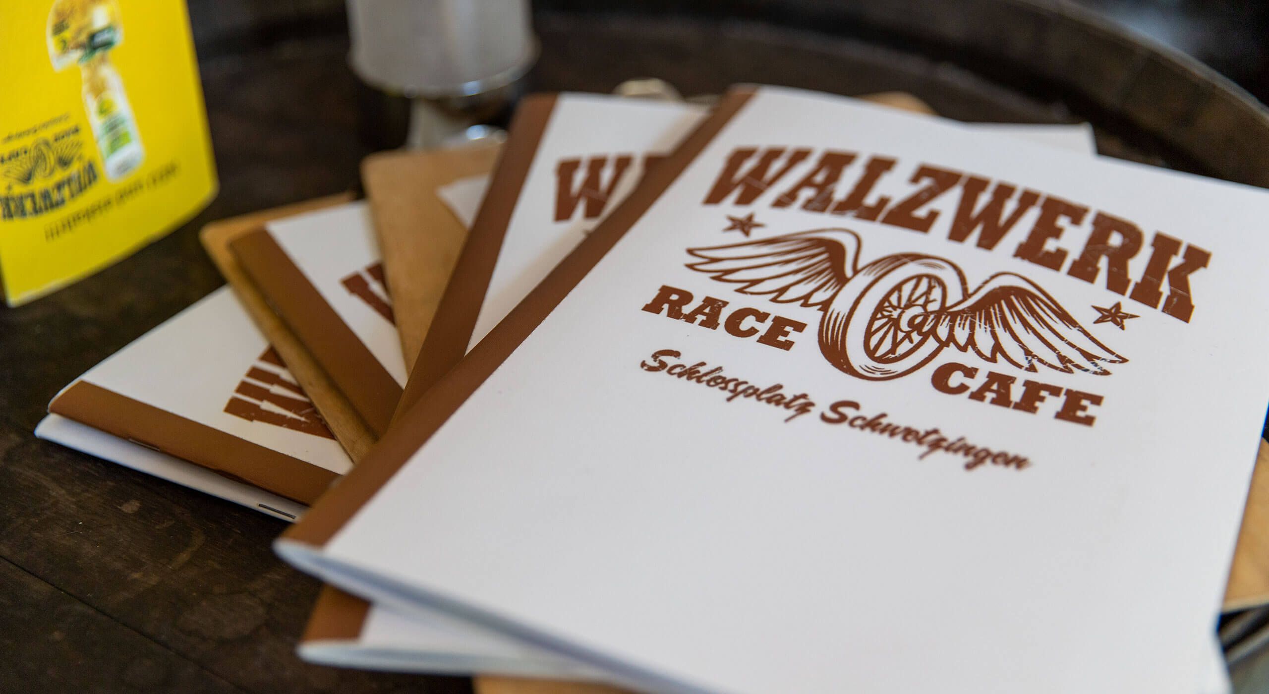 Das alte Cafe wurde umgebaut zum „Walzwerk Cafe“. Mit einem Design, dass jeden Besucher fasziniert und alle Biker-Herzen höher schlagen lässt. Hier hängen nicht nur Fotos und Motorsport-Utensilien an den Wänden sondern unter anderem auch Reifen und Motorräder.